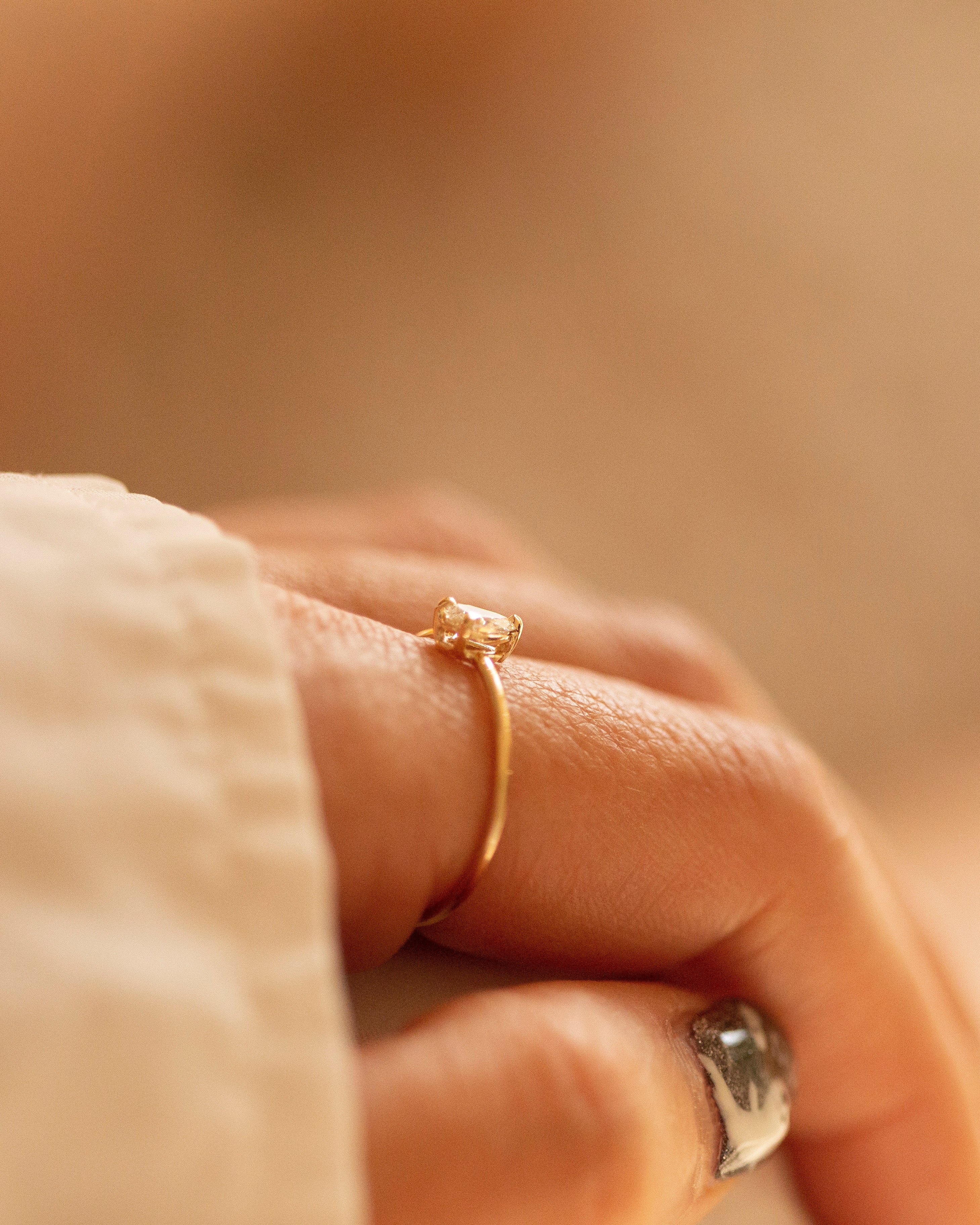 This dainty 14k gold pear lab diamond ring shines with timeless simplicity.