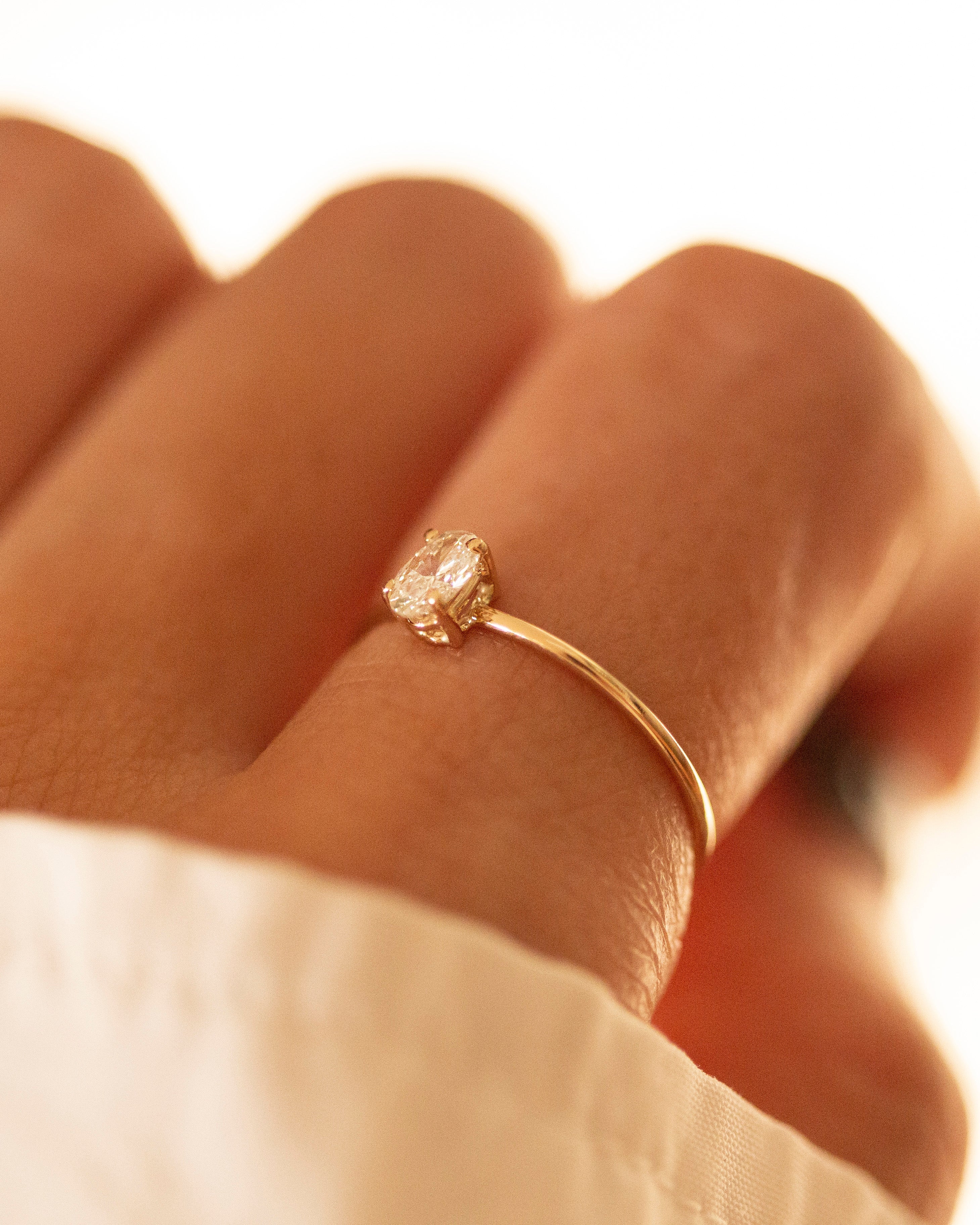 Elegant, timeless, and perfectly dainty. This oval lab diamond ring adds effortless sparkle to any stack. Handcrafted in solid 14k gold featuring a 3.5x5mm lab grown diamond with exceptional VVS-VS clarity and D-F color for a brilliant near colorless shine. Details: material: Solid 14k gold Stone: Lab grown oval cut diamond. 3.5x5mm .VVS- VS, D-F color Band width: 1mm