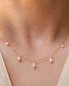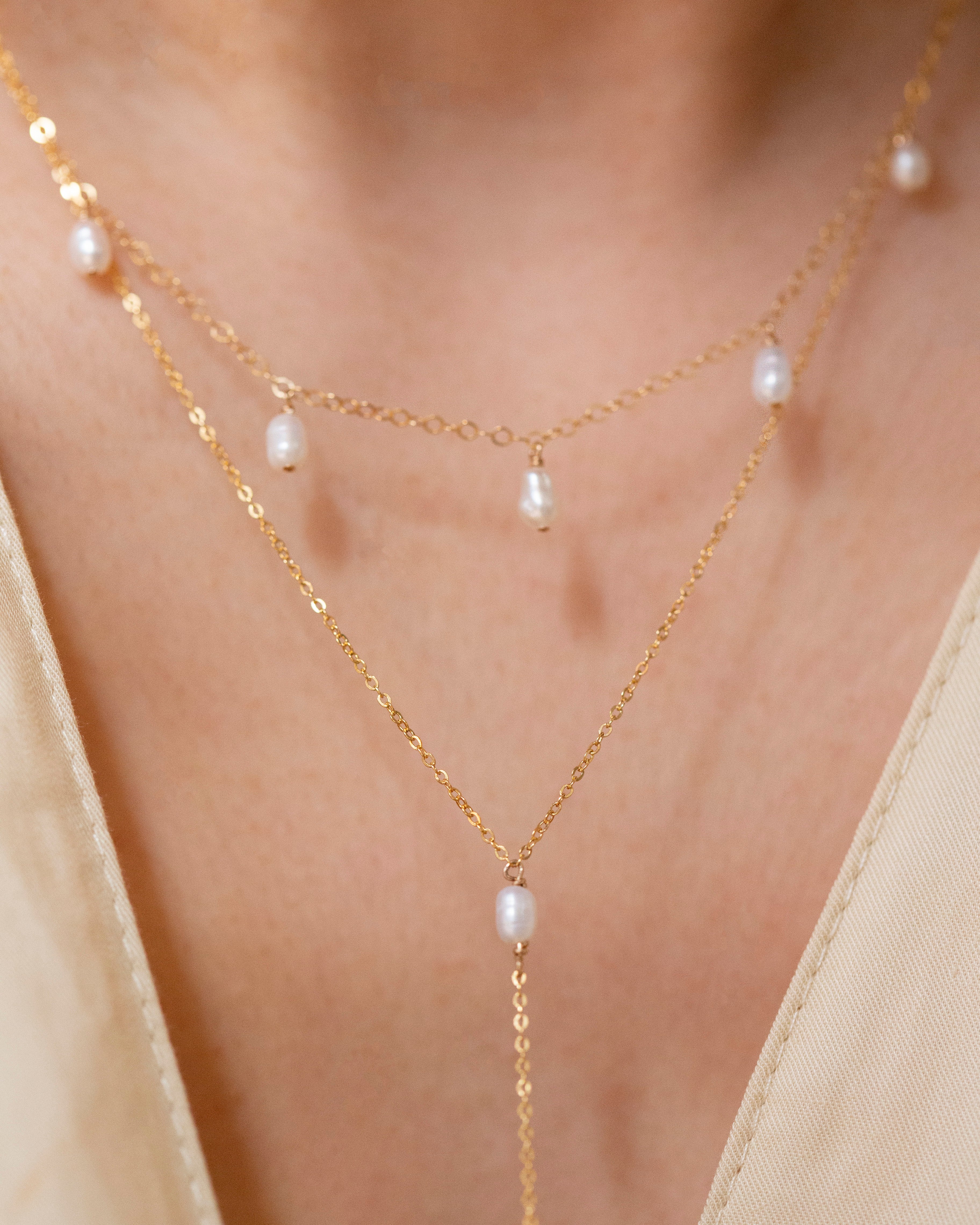 A timeless dainty pearl necklace made with solid 14K gold and luminous natural freshwater pearls. Designed to catch the light with soft movement, this delicate pearl dangle necklace sits beautifully along the collarbone for an effortless, elegant look.