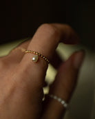Delicate yet distinctive, this ring features a fine ball chain adorned with a dangling freshwater pearl charm. The pearl gently swings between your fingers, adding an elegant, effortless charm to every movement. Perfect for stacking or wearing alone for a minimal, graceful statement.